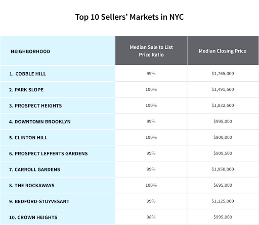 With median-sale-to-list ratios of 100%, the Rockaways, Clinton Hill, Prospect Heights, and Park Slope were among the most competitive markets in NYC. It’s probable that buyers are experiencing strong bidding wars in these areas with prices shooting up to astronomical highs, no doubt making NYC even less affordable.