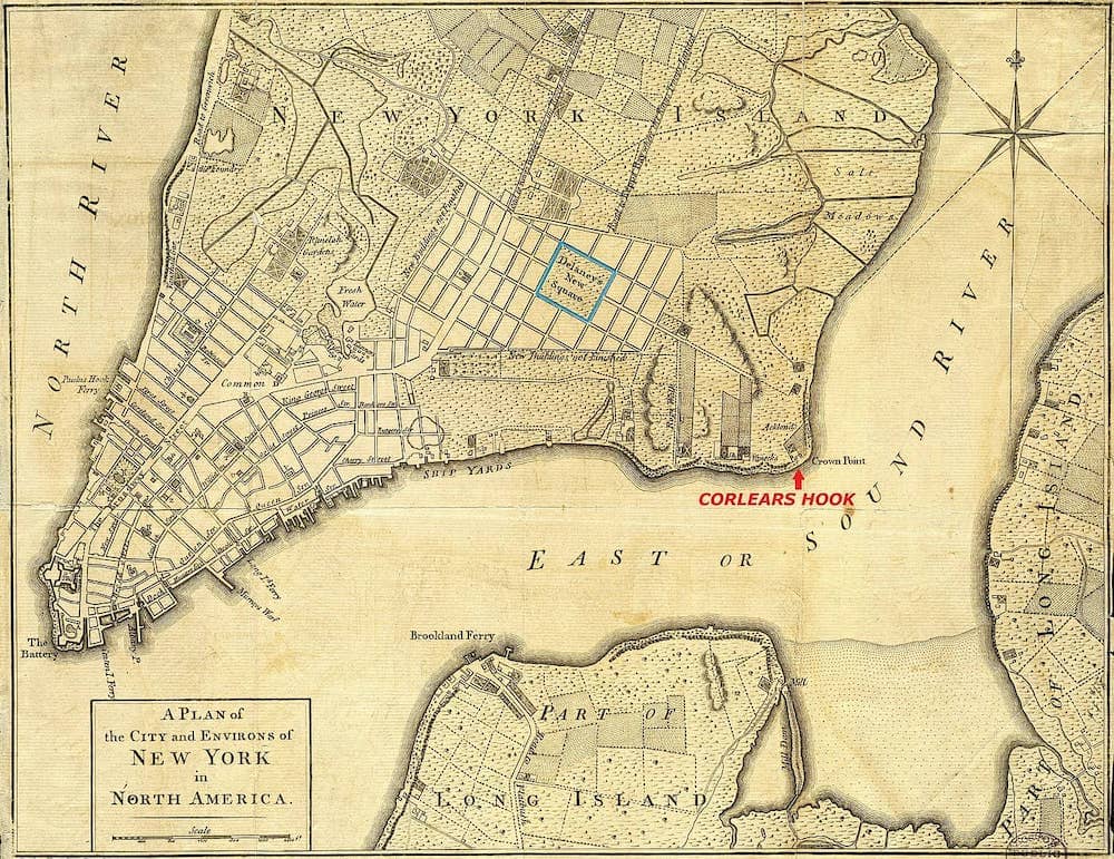 In the 1600s, Dutch settlers along with an enclave of freed black farmers and members of the Lenape Nation were all living in the area that would eventually become the Lower East Side. According to the Encyclopedia of New York City, the Lenape would eventually be displaced, and the farms purchased by the Delancy family, who would hold onto this large chunk of Manhattan for quite some time. One of the only sections that didn’t belong to Delancy was Corlears Hook, a port used by the Dutch and later by the British.